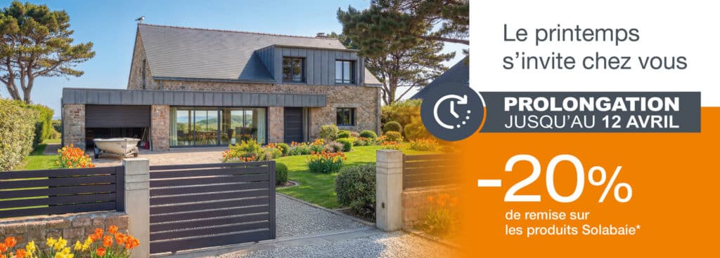 * Offre applicable sur les devis signés du 16 mars au 4 avril 2026, prolongation de l’offre jusqu’au 12 avril dans l’ensemble des magasins SOLABAIE. Une remise de 20 % sera appliquée sur la fourniture des produits de la gamme SOLABAIE (fenêtres, baies, portes-fenêtres, portes d’entrée, volets roulants, volets battants aluminium, portes de garage, portails et clôtures, stores bannes, stores ZIP, brise-soleil orientables et pergolas). Hors menuiseries en forme, menuiseries bois gamme HERITAGE et pièces détachées pergolas. Offre non applicable sur la fourniture seule. La remise s’applique uniquement sur la fourniture des produits et non sur la pose, due en sus. Offre non cumulable avec d’autres offres promotionnelles en cours ni sur des devis établis avant les dates de promotion. L’offre n’est pas conditionnée à un minimum d’achat.