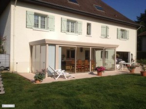Cette véranda style Classique en aluminium, espace rapidement ouvert sur le jardin grâce à ces grandes baies vitrées, devient une partie intégrante de la maison. Utilisée ici comme salon/salle à manger.