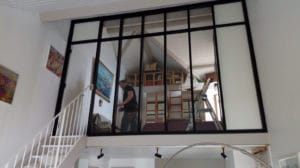Fabrication d’une verrière intérieure, en fermeture d’une mezzanine, réalisée en bois avec une finition peinture, dans nos ateliers.