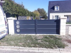Installation d’un portail battant en aluminium « Heliconia » avec hublots dans un coloris gris anthracite près de Homblières (02).