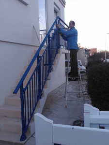 Balcon et rampe en cours de pose en aluminium laqué RAL 5010. Laquage certifié Qualicoat – Qualimarine. Poteaux aluminium. Pose sur dalle. Main courante diamètre 55 mm. Barreaux arrondis diamètre 20 mm. Rampe assortie. Très grande résistance aux intempéries. Chantier effectué à LAGORD 17140. Communes voisines LA ROCHELLE 17000, PUILBOREAU 17138, AYTRE 17440, L’HOUMEAU 17137, DOMPIERRE SUR MER 17139.