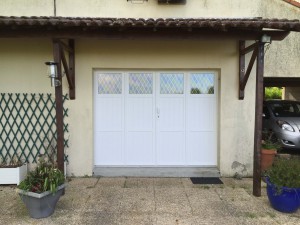 Installation d’une porte de garage blanche en PVC avec cassettes et hublots carrés.
