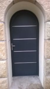 Installation d’une porte d’entrée aluminium cintrée en renfoncement sur une maison à pierres